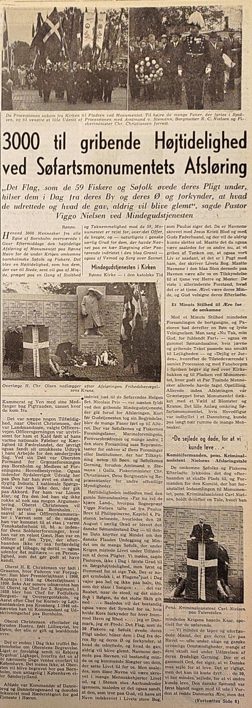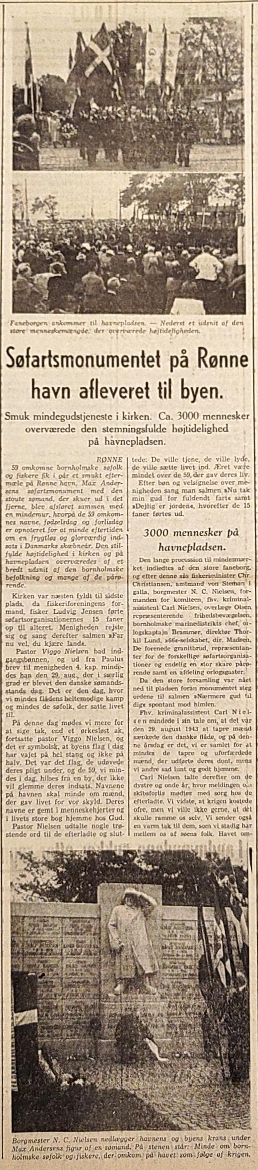 Søfartsmonumentet over faldne, bornholmske søfolk blev indviet august 1949, se avis artiklerne, fra 30. august 1949, længere nede på siden.